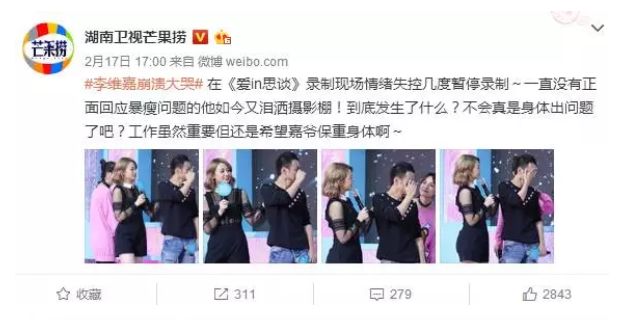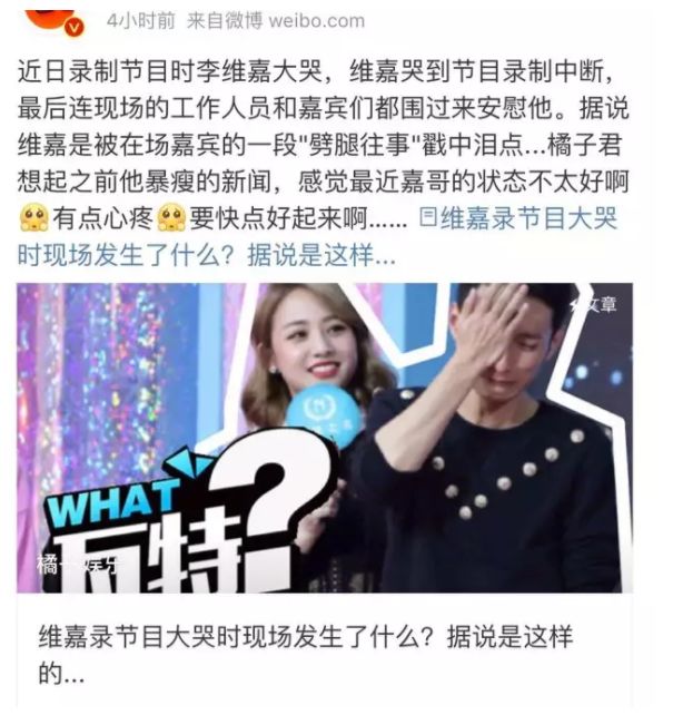 而维嘉大哭的原因也有人说是,因为录制节目中被小鲜肉的一段情感经历而戳中内心,才导致洒泪现场。