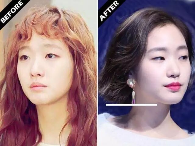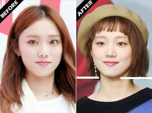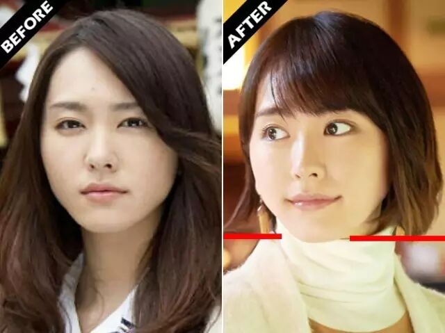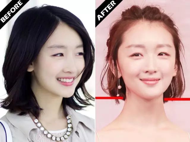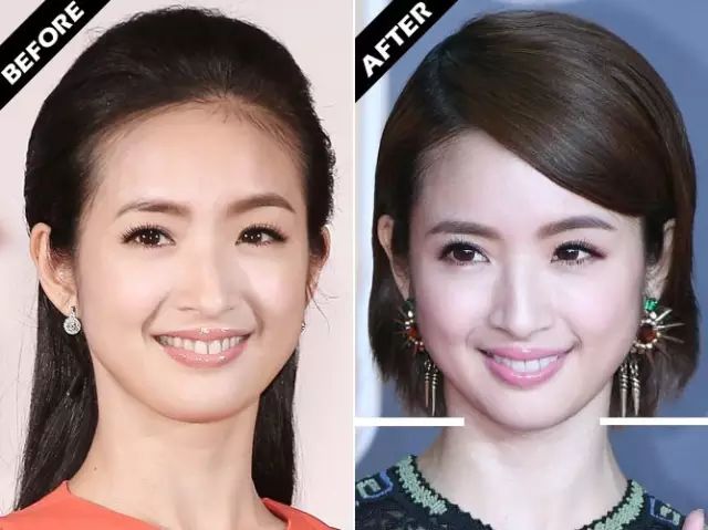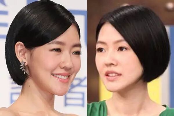 水原佑果的脸蛋儿属于长鹅蛋形,当梳着发尾触到耳朵的超短波波(左图)时,鼻头以下的脸被全部露在外边,视觉上将长脸型凸显得更长了;而换上“耳坠剪”(右图)后,长脸型的弊端被明显弱化,配合内扣发尾,营造出脸蛋儿往横向饱满的假象。▼