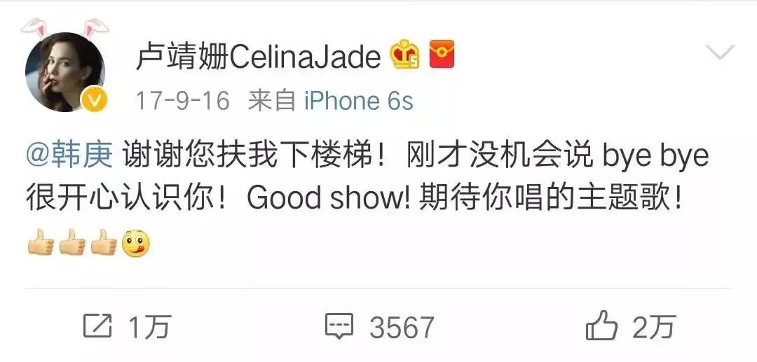 因为卢靖姗特意发了微博说感谢韩庚扶她下楼梯,很开心认识他。