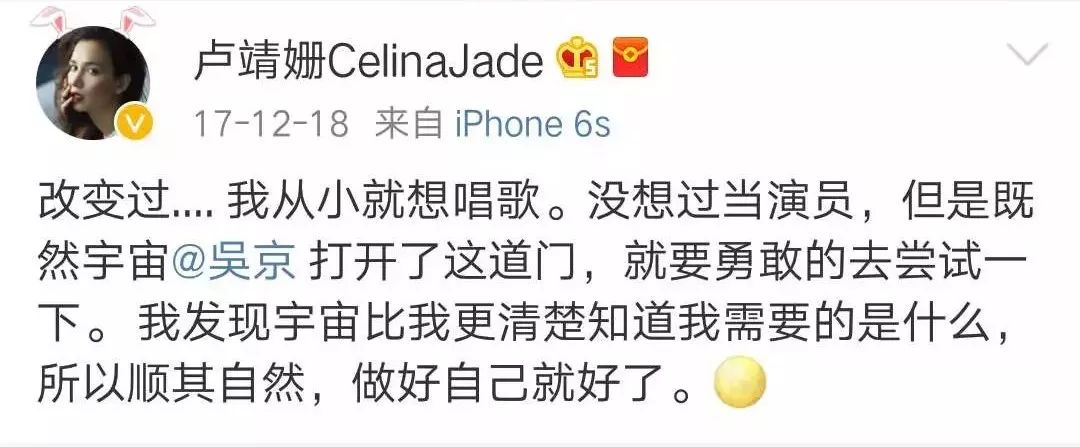 但大家可能没有注意到,其实比起做演员,卢靖姗的最大爱好竟然也是唱歌,她在微博访谈里回答粉丝提问时说:“我从小就想唱歌,没想过当演员,但是既然吴京打开了这道门,就去试一下。”