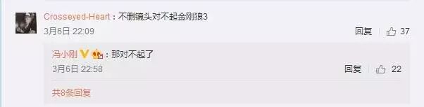 网友犀利补刀说,“不删镜头可对不起《金刚狼3》”,冯导犀利怼网友:“那对不起了。”