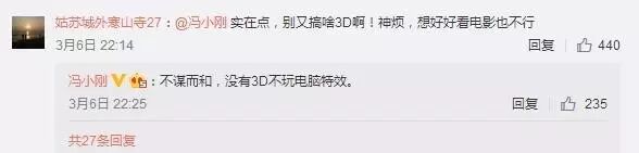 也有网友表示,“实在点,别又搞啥3D啊!神烦,想好好看电影也不行。”冯小刚则回复说:“不谋而和,没有3D不玩电脑特效,我们是实拍的。”