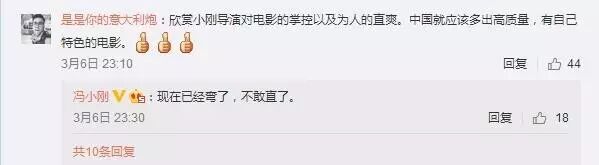 有意思的是,冯小刚导演发微博当天似乎心情不错,还饶有兴趣地回复了不少网友的留言。