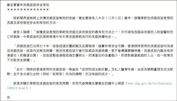香港特区卫生署发言人也在2月8日重申,“接种季节性流感疫苗是预防流感及其并发症安全和有效的方法。”