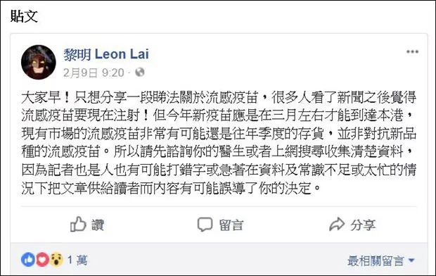 2月9日,黎明在个人脸书上发帖,质疑香港现有流感疫苗可能还是往年季度的存货,并非对抗新品种的流感疫苗,他还呼吁公众在接种疫苗前,最好先咨询医生或收集资料。
