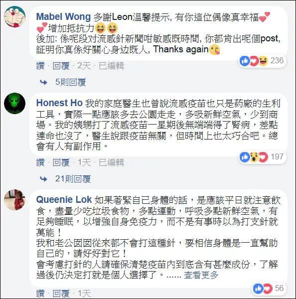 2月10日,香港大学感染及传染病中心总监何柏良在香港一档电台节目中表示,流感高峰期下医生已经疲于奔命,希望“天王高抬贵手”,“娱乐归娱乐,医学归医学,让我们医生做回看病的事。”何柏良表示,将医学信息娱乐化是一件很危险的事,他建议市民若对流感疫苗有疑问,应寻求医生意见,自行上网查阅数据时,也应慎选来源,寻找正确的信息。