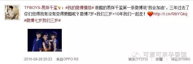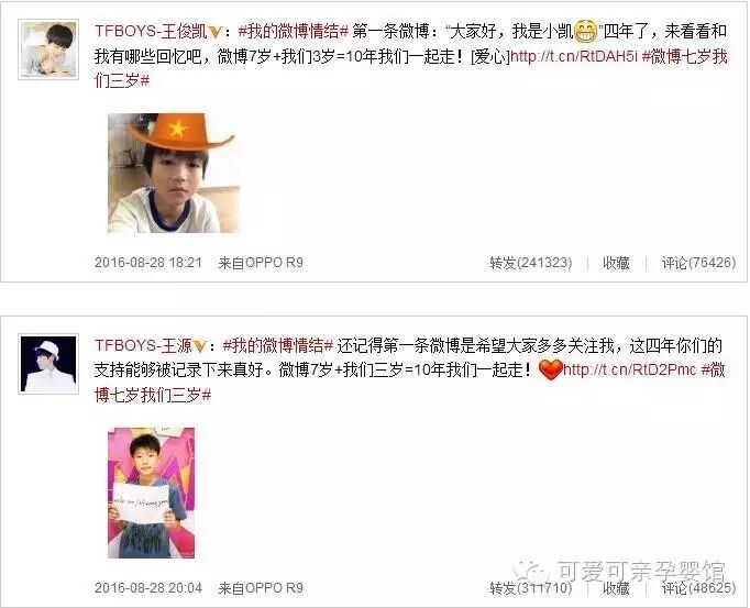 新浪娱乐讯 8月28日是微博7周岁生日,许多明星都纷纷晒出自己的微博情结为微博7周年助力。当晚已经出道三年的TFBOYS组合成员王俊凯、王源和易烊千玺纷纷在微博中晒出自己的首条微博,与广大网友分享自己的微博情结。