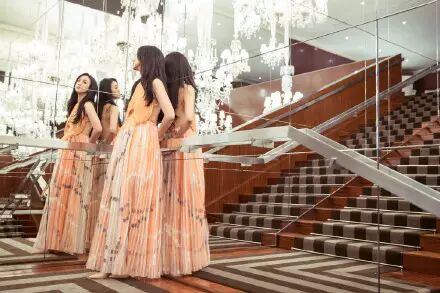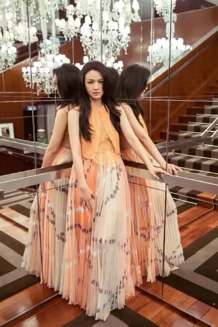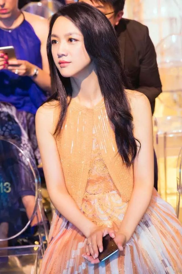 看这照片,肤白貌美的汤唯,搭配上一袭橘黄色无袖长裙,显得肤色红润,气色倍儿佳。