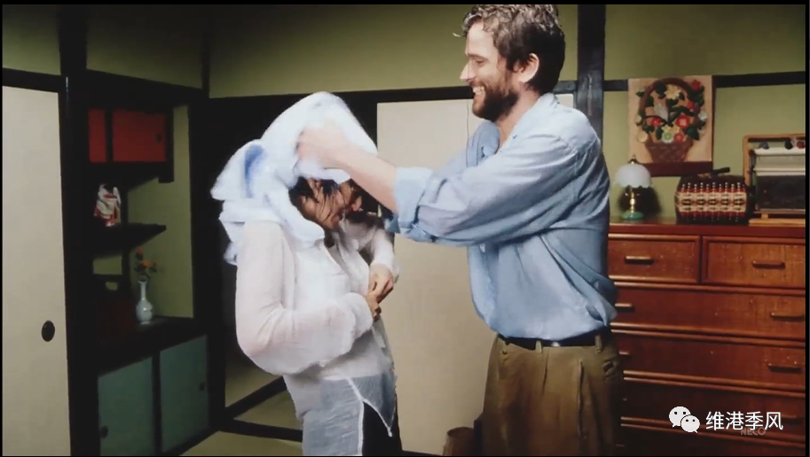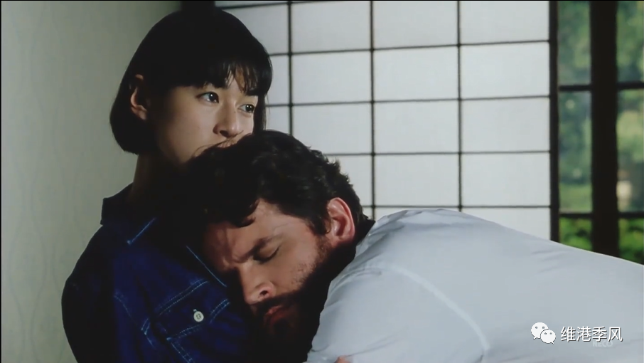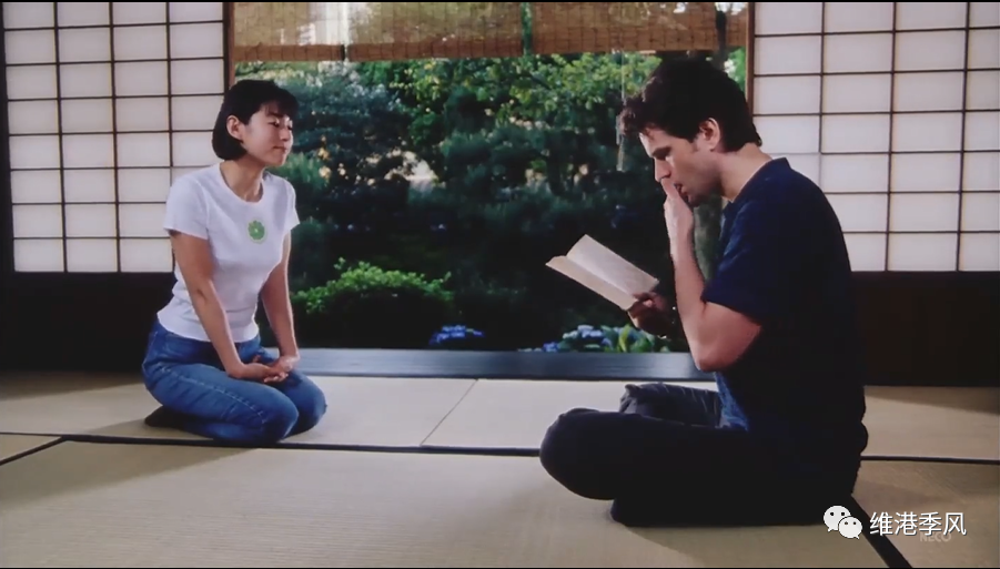 男主人公一进房间,跪倒榻榻米上,女主京子听声辨形,知道他坐得不舒服,告诉他可以随意坐。一个失明的人,感觉如此灵敏,男主人公吃了一惊呆,在看着她清秀的脸庞,有点沉醉。
