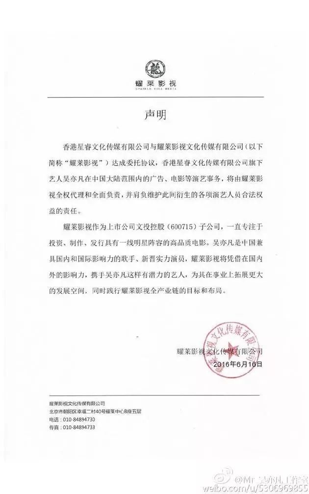 昨日(6月16日)晚间18点53分,微博名为Mr_吴亦凡工作室的微博发布声明称,香港星睿文化传媒有限公司与耀莱影视达成委托协议,香港星睿文化传媒有限公司旗下艺人在中国大陆范围内的广告、电影演艺事务,将由耀莱影视全权代理和全面负责,并肩负维护此间衍生的各项演艺人员合法权益的责任。