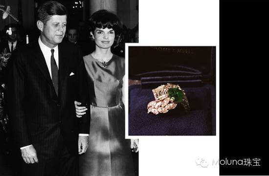1953年,Jackie O。从约翰·肯尼迪那里得到了这枚梵克雅宝的祖母绿宝石搭配钻石的订婚戒指,杰奎琳还亲自改造了戒指的设计,重新创造,这样的戒指在当时绝对是引领潮流。