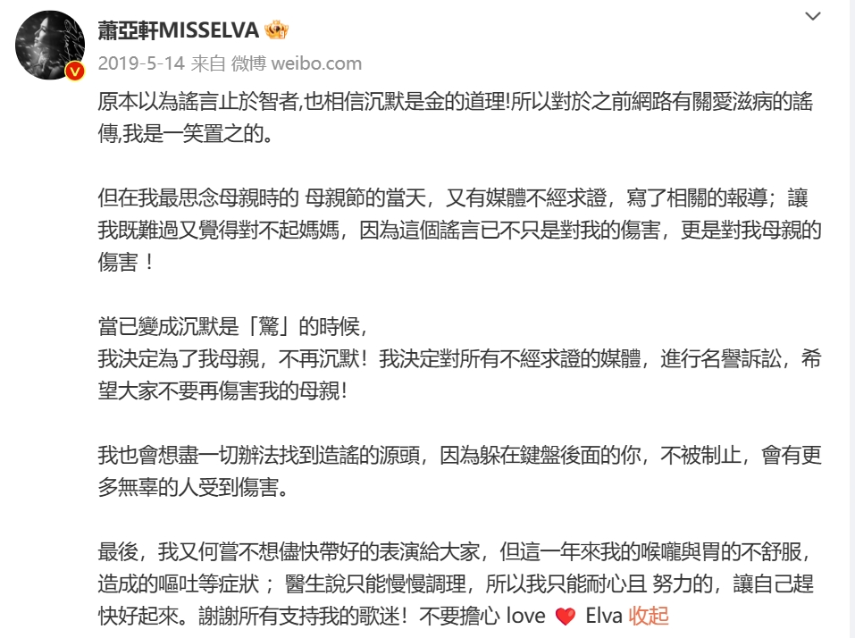 2018年,突然有一些恶意的小道消息, 称萧亚轩感染了某疾病,理由是她似乎频繁呕吐,“可能免疫系统出现了问题”。