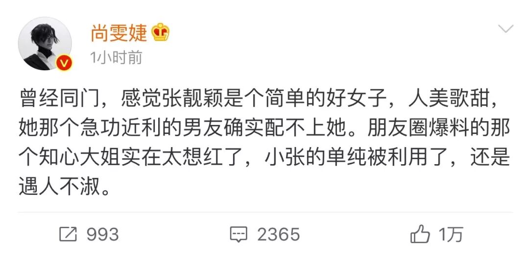 在张靓颖离婚传言正热的时候,在当事人张靓颖并未回应的情况下,尚雯婕却发了一条指名道姓的“真性情”微博。