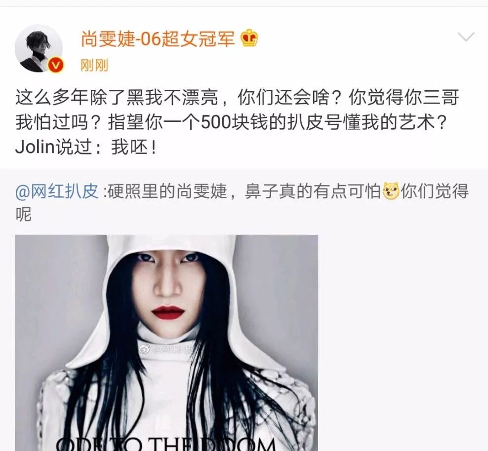其实这已经不是尚雯婕第一次在微博上怼人,有一次尚雯婕开直播,有网友说她丑,尚雯婕毫不含糊的就回了一句“长得丑就憋看,贱呐!”