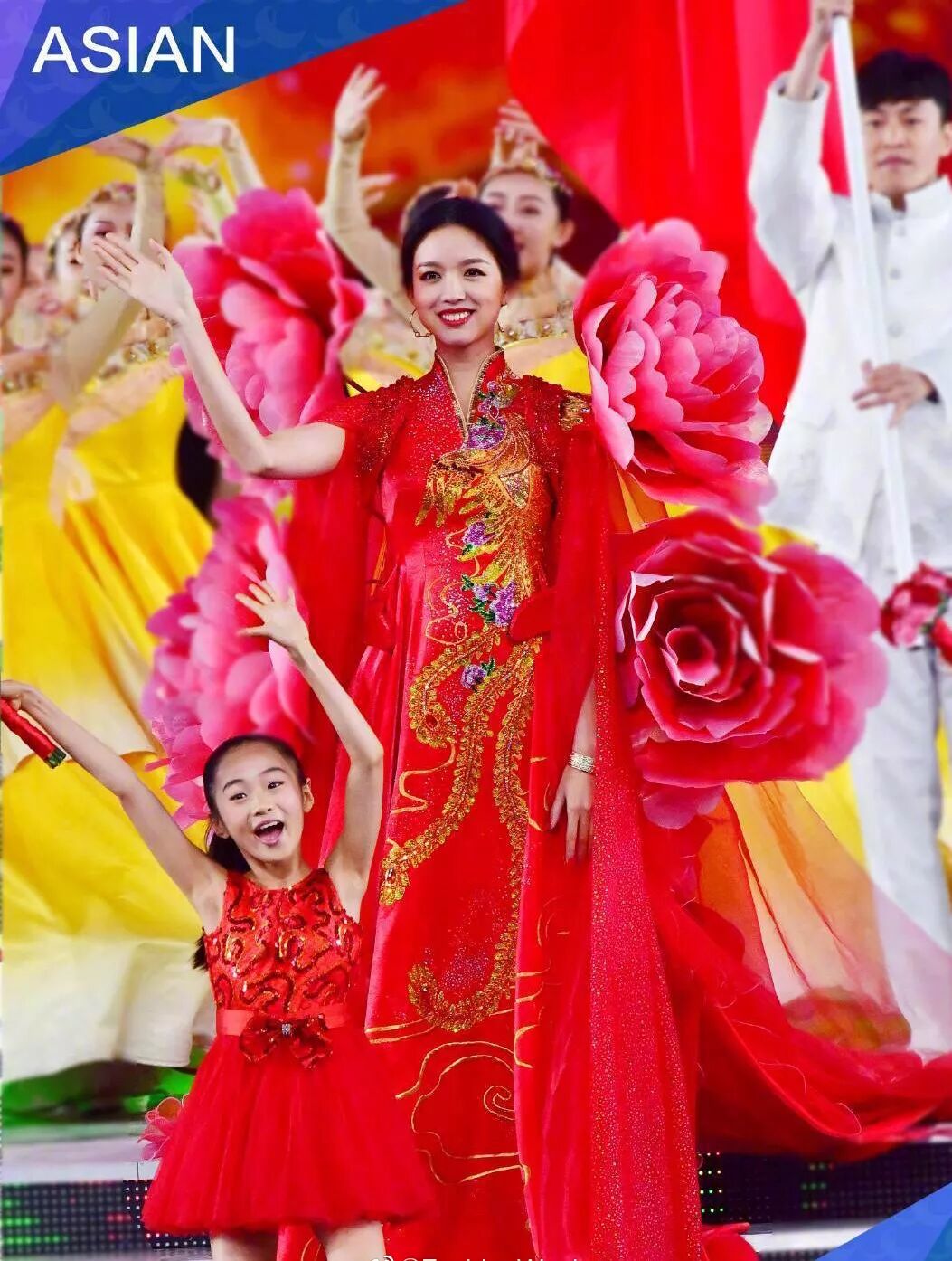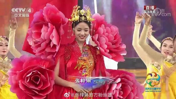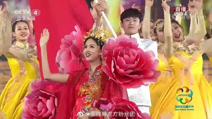 ▲让大家突然吹起彩虹屁的就是张梓琳在亚洲文明对话大会上的这个look啦,一袭大红色绣凤长裙配以四朵牡丹加身,没点气质的还真是很难驾驭。
