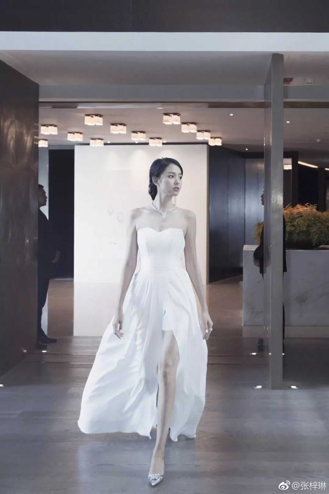 ▲白色抹胸裙搭配银色尖头高跟鞋,标志性的长腿就不多夸了,浑身上下散发出的恬静气质只让人觉得美好。