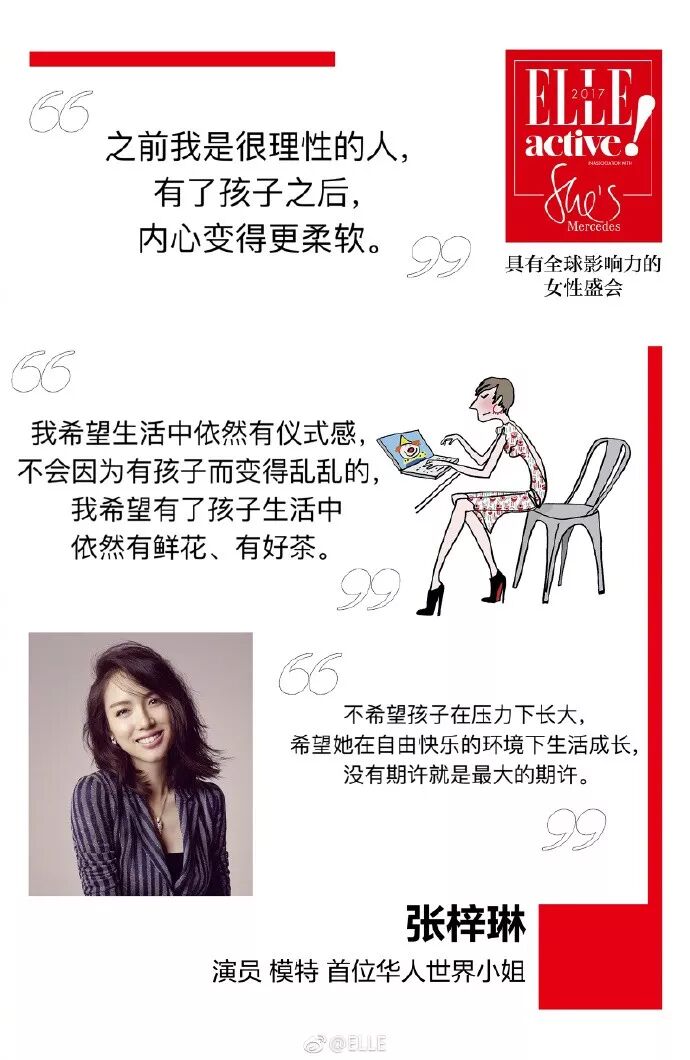 ▲梓琳曾告诉ELLE,孩子的出生在她的理性特质中加入了一些柔软,也希望“胖妹”可以自由快乐地长大,可能这样的一份豁达的心态,对于梓琳的气质也有加成作用吧。
