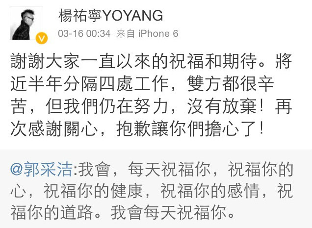 杨佑宁随后也发文:“谢谢大家一直以来的祝福和期待。将近半年分隔四处工作,双方都很辛苦,但我们仍在努力,没有放弃!再次感谢关心,抱歉让你们担心了!”