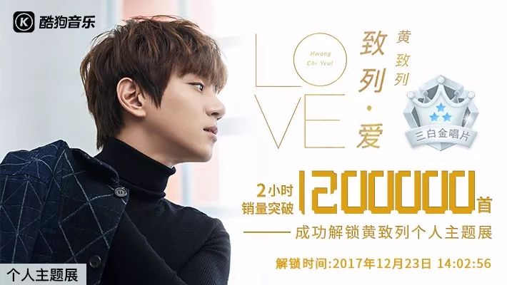 12月23日,新专辑《致列·爱》在酷狗预售后,2分01秒销量突破40万首,2小时销量突破120万首,成为酷狗平台最快突破白金唱片和三白金唱片等级认证的数字专辑,并升级解锁酷狗独家福利【上海震旦LED】、【黄致列个人主题展】!