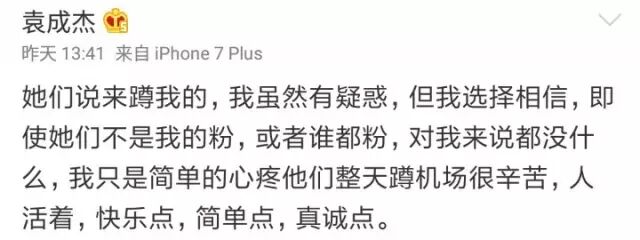 袁成杰知道了这一切也是蛮郁闷的吧,他说不管是谁的粉,他只是简单的心疼他们整天蹲机场很辛苦。