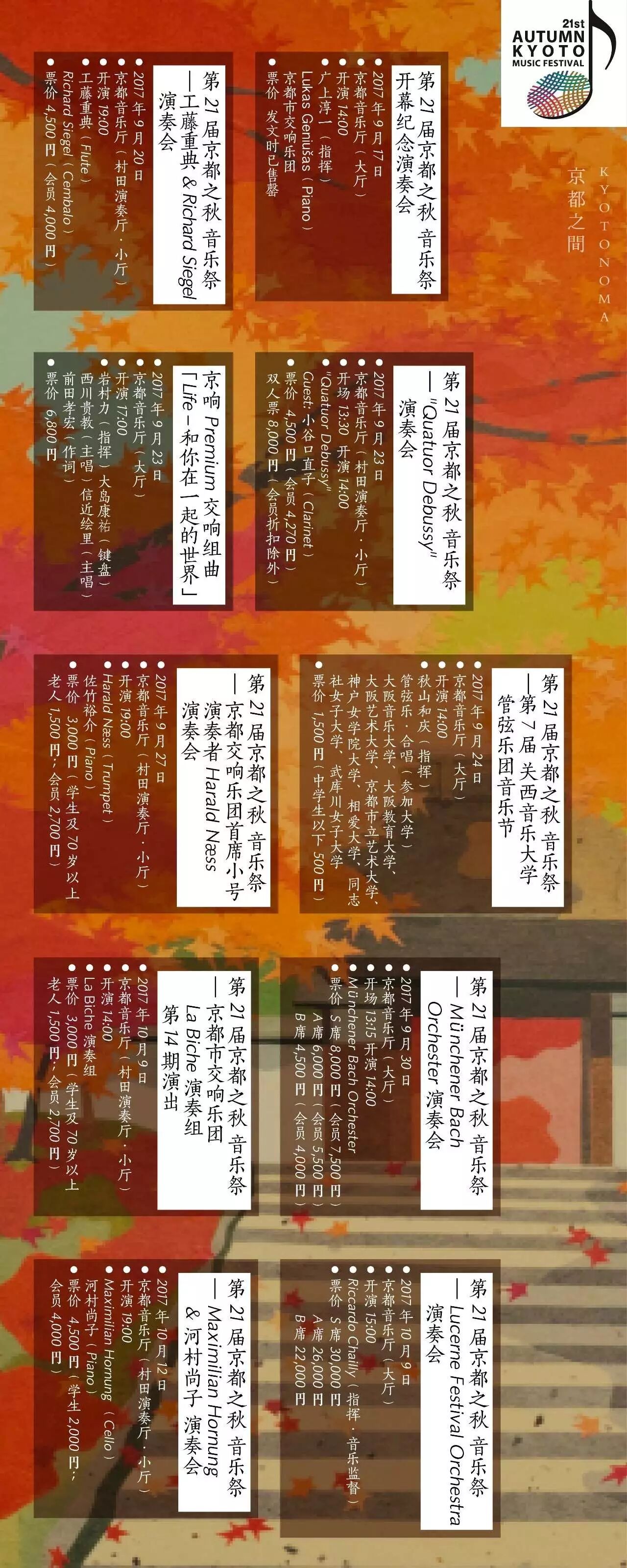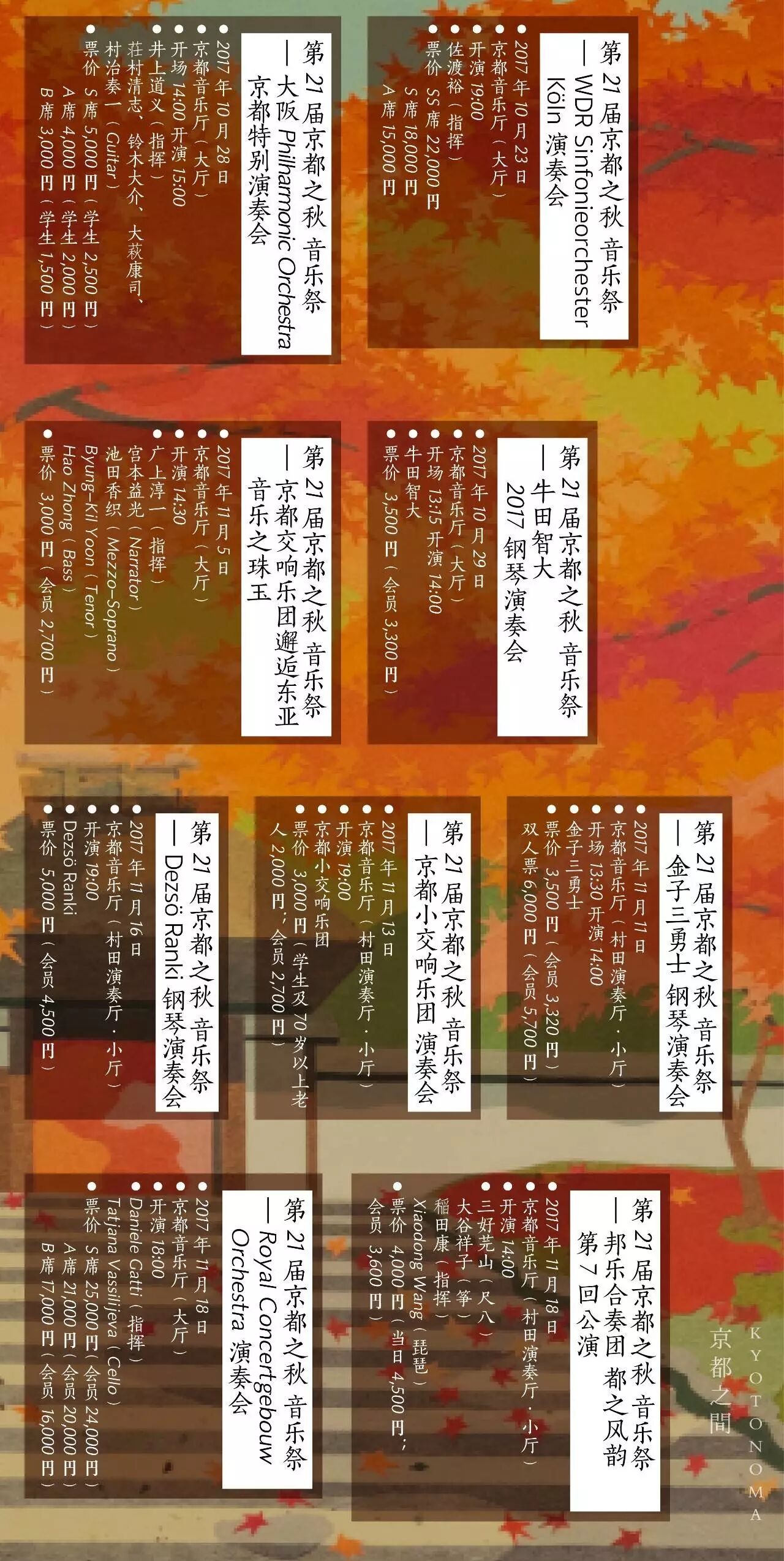 就像是一场盛宴,交响乐、爵士、民谣、传统民乐,不同类型的音乐风格都可能遇见;规模宏大的现代音乐厅、隐于巷陌中的古旧建筑,或是庄严肃穆的古刹,也都可能成为最独特的舞台。并非都是那么一票难求不可觊觎,这些伸手就可以触碰到的音乐活动,是京都之秋市民和游客们最怡人的精神消遣。