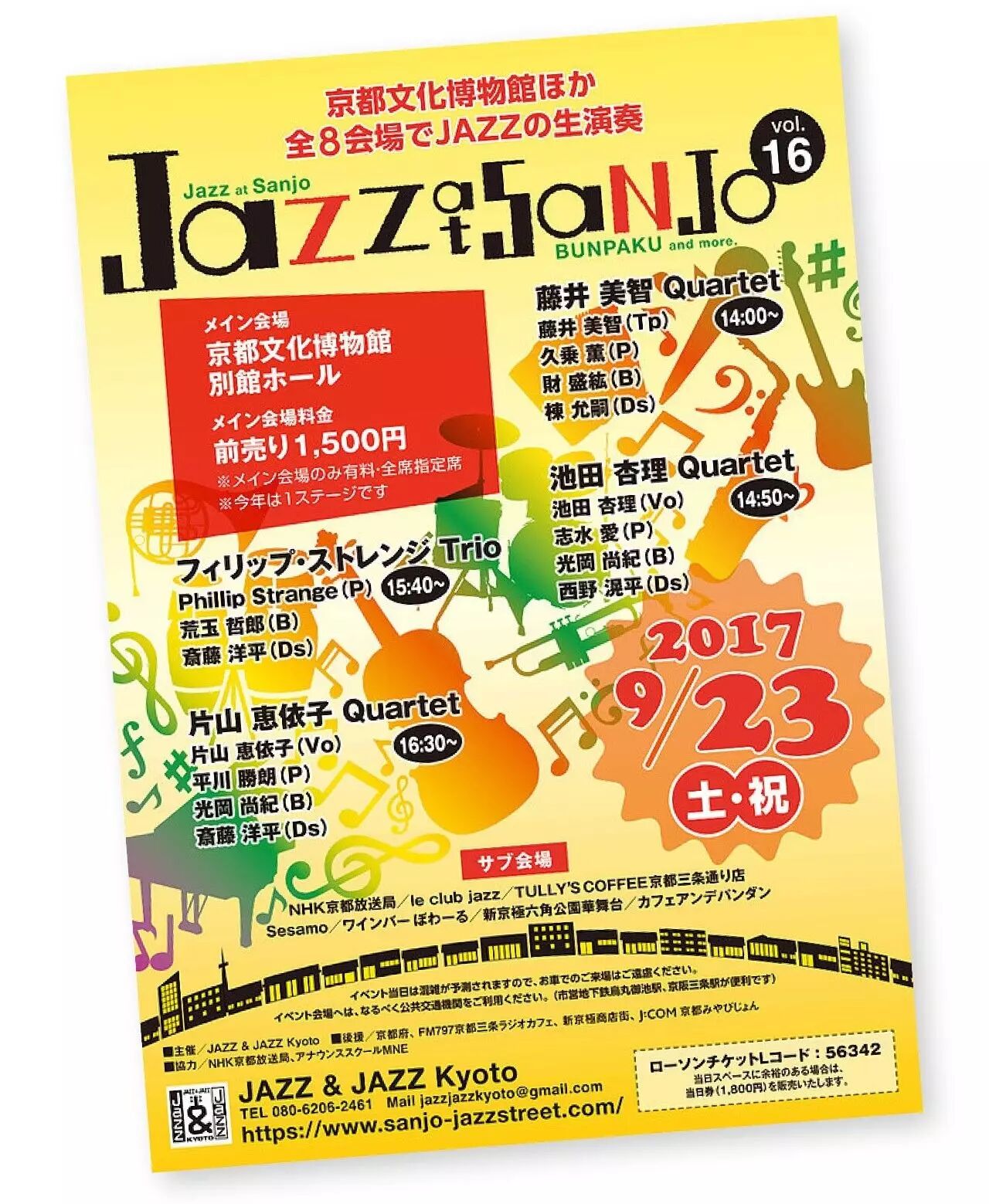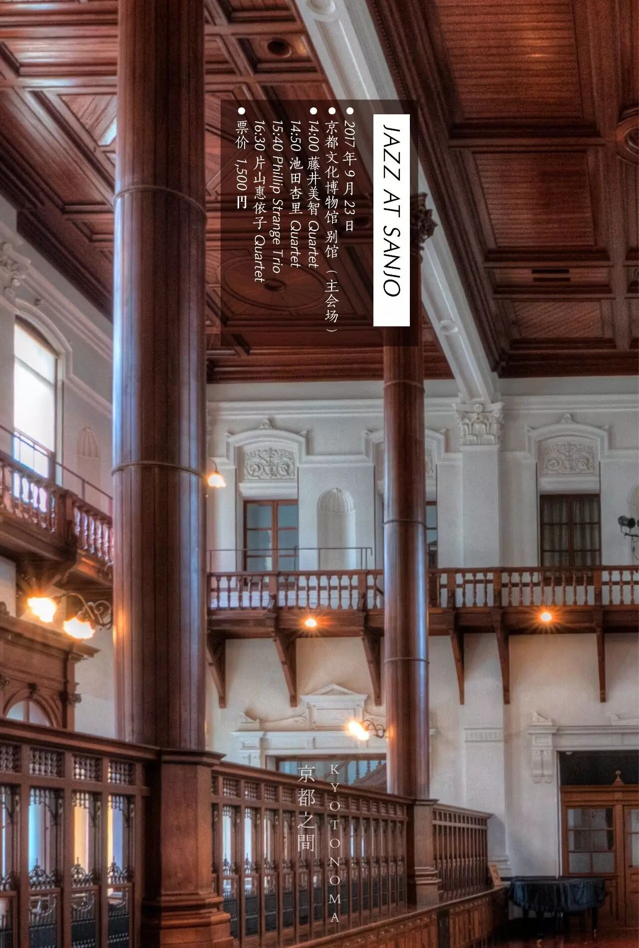 京都从来不拒绝多样的文化元素,当爵士乐灌注于此也同样得到了尊重。出身于京都的作家村上春树是出了名的爵士迷,京都街头的爵士吧从不乏人气聚集,大小爵士活动落户京都弘扬着爵士文化,不仅满足了本土爵士迷们的需求,也把真正的爵士乐从京都带给了更多人。9月23日以京都文化博物馆为主场的八大会场,将再次将精彩的爵士现场一一展现给乐迷。如果您也喜欢爵士乐,请不要错过JAZZ AT SANJO !