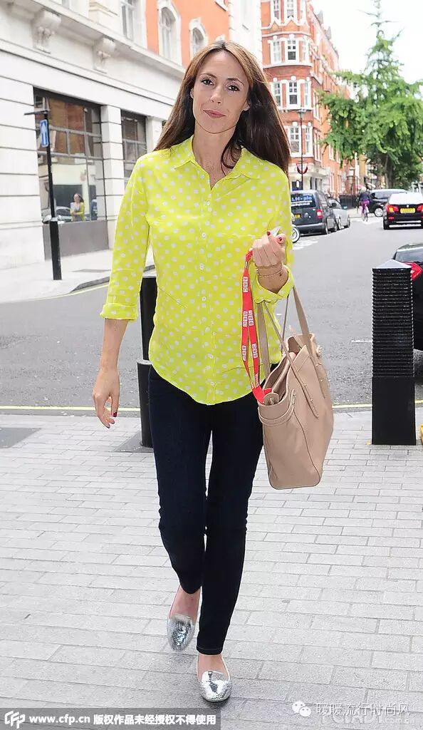 艾力克斯·琼斯(Alex Jones)现身街头。她身穿黄色波点衬衫,手拎裸色手袋,脚踩银色平底鞋相当引人注目。