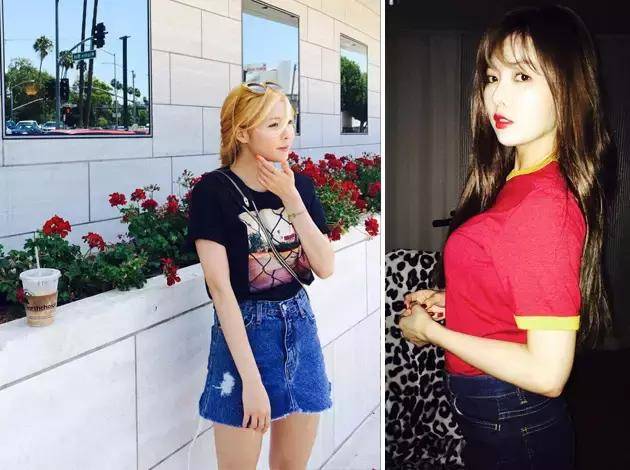 简单的T恤打造出美式休闲风,大胸的泫雅比较注重腰身,所以会将T恤折进去。