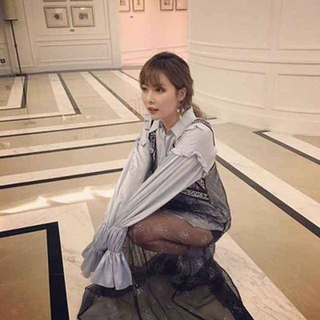 长直发的泫雅可不多见,泡泡袖公主式上衣,袖口的珍珠,和绸缎的面料,整个看着好贵!