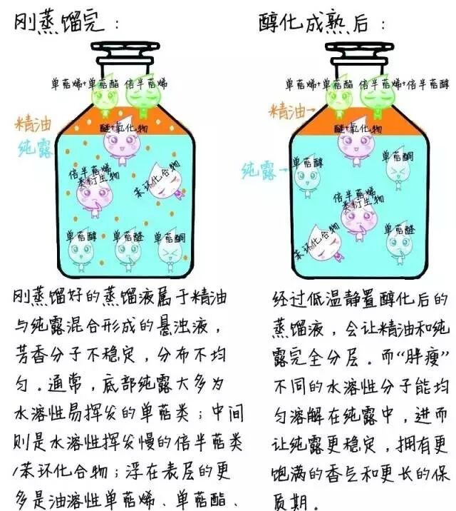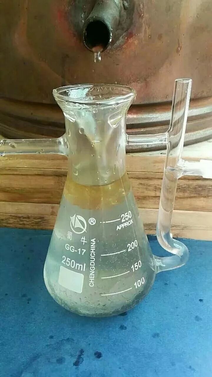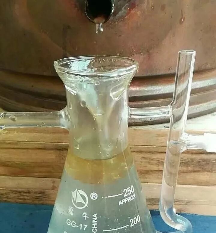 植物通过蒸馏后,产生的液体,因密度和性质不同,亲油的挥发性有机化合物成分,一般浮在上层(密度比水大的极端品种也有),就是我们称之为精油的东西,下层的冷凝水一般称为纯露。