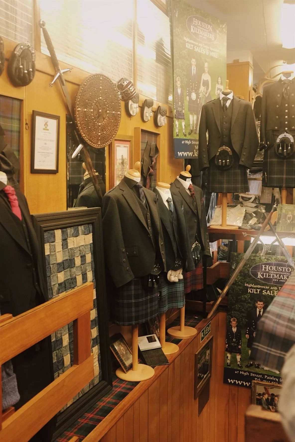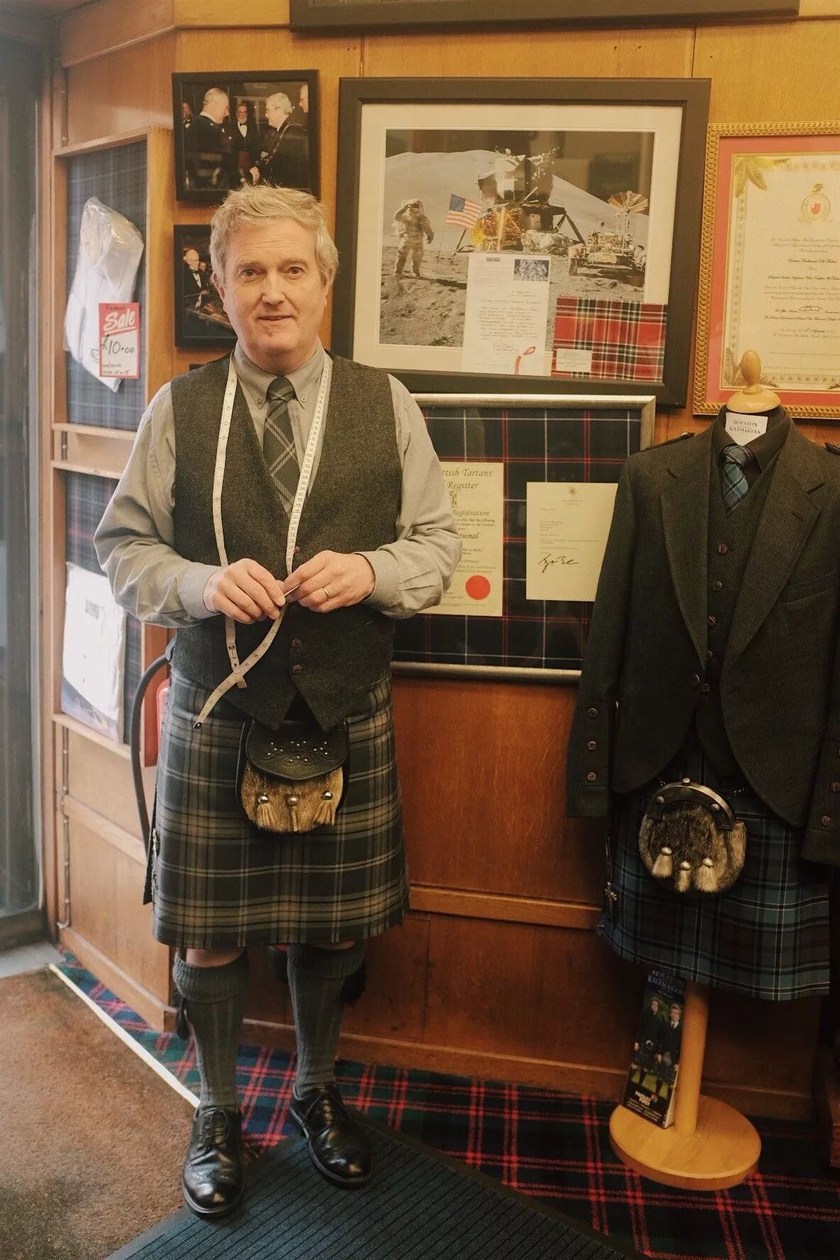 我提出给店主照相,他选了这个背景。墙上贴的是一些老照片,有菲利浦亲王参观并鼓励的照片和证书。还有宇航员Alan Bean登月的照片,他也是苏格兰格纹的忠实爱好者。