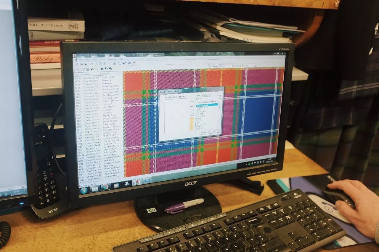 他向我演示起设计格纹的方法,在电脑上可选各种颜色,它们会根据已有的设定组合这些颜色,再调整不同格子的大小。根据客人的要求和性格设计格子和颜色。成稿的设计图像五线谱一样,这些看似简单的排列组合,引领了一年又一年不褪色的流行。