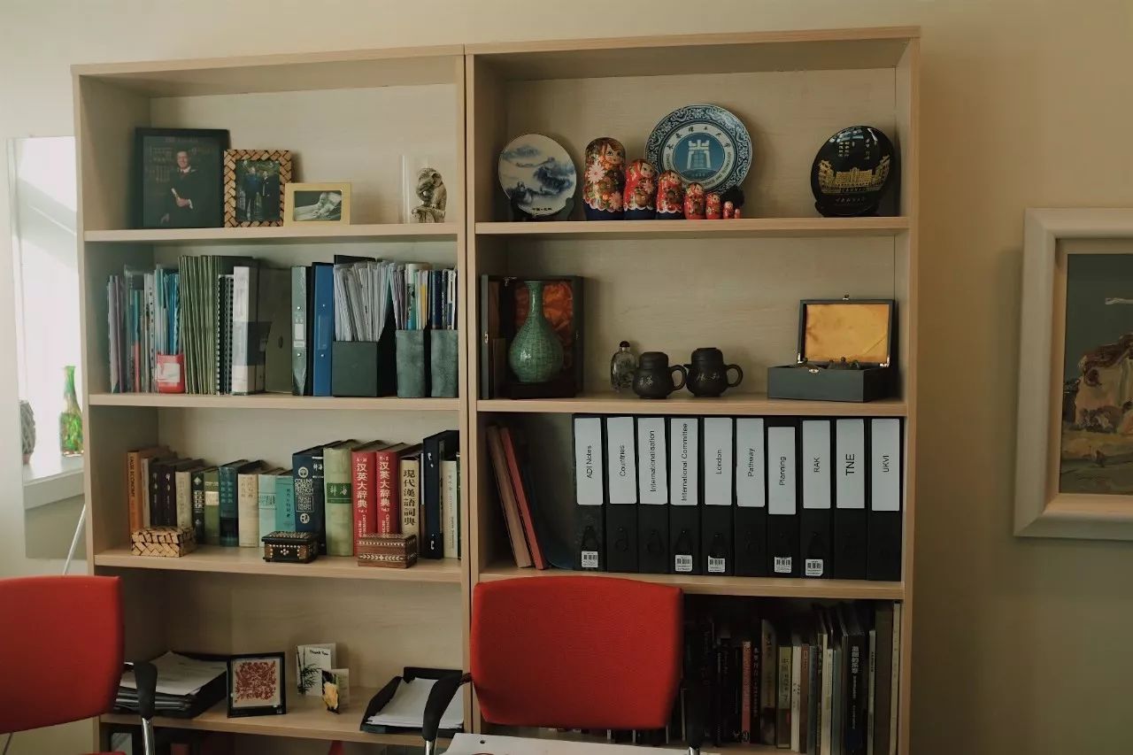 他的办公室非常的“中国”,无论是墙上的水墨画,还是桌上的熊猫,或是排列整齐的中文书籍。他在我的一阵惊叹中笑说,“我在中国的时候,你还不在呢”。