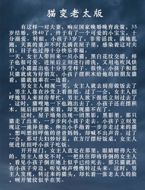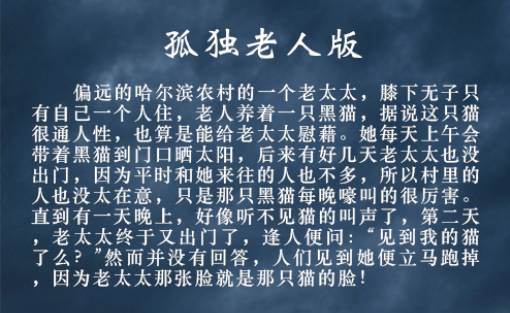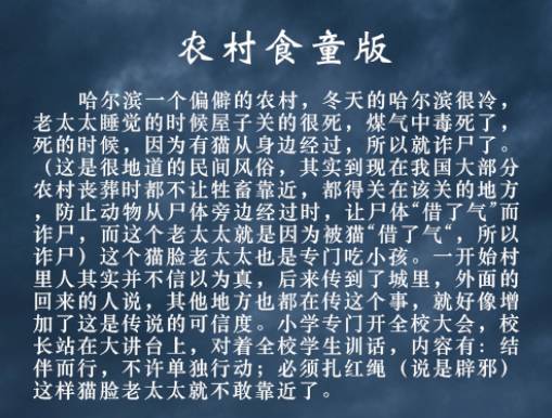 过了这么多年,故事越传越广,除了上面提到的最有名的两版,后来猫脸老太太的故事又演绎出更多版本,连猫身人脸都有了,这脑洞,也是太大了点。