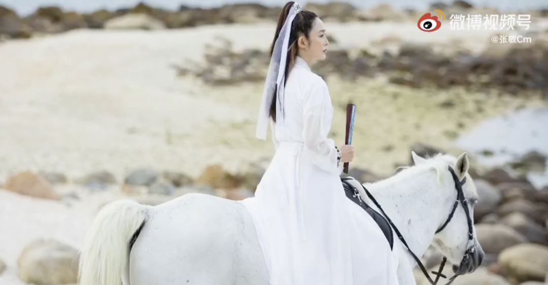 张敏所饰演的赵敏受到很多观众的喜爱,她男性打扮,扎着发髻,身着白色飘逸古装,骑着白马,五官秀气但英气逼人,这一回眸堪称惊为天人。