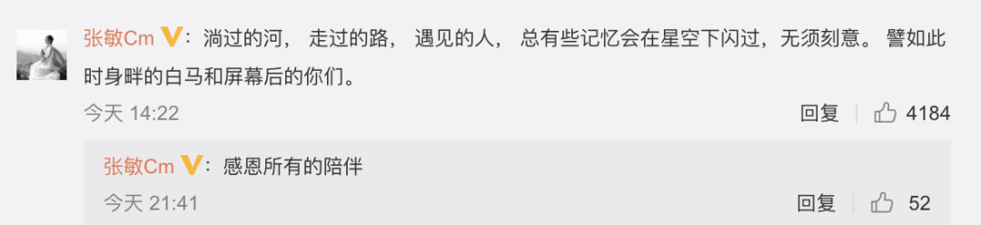 张敏还在评论区里非常文艺地补充道:淌过的河,走过的路,遇见的人,总有些记忆会在星空下闪过,无需刻意,譬如此时身畔的白马和屏幕后的你们,感恩所有的陪伴。