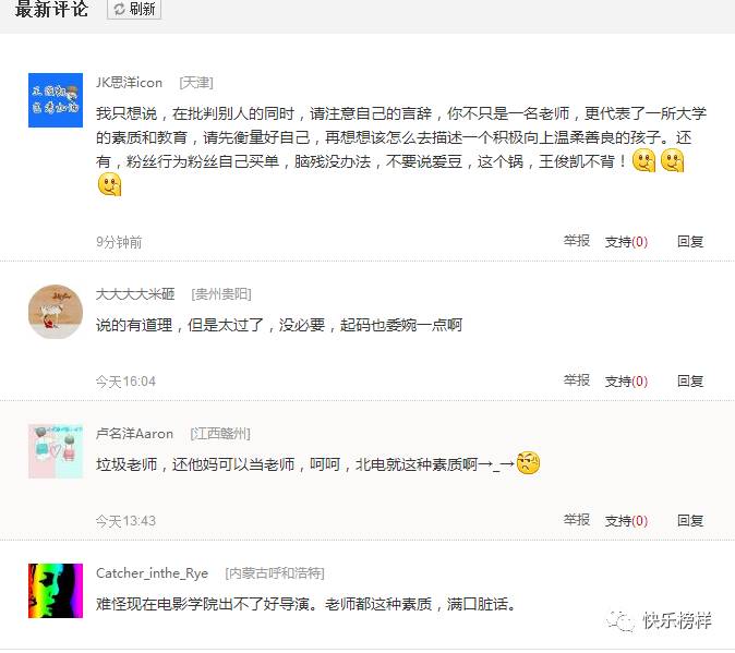 相传有位北电老师因为王俊凯的到来而导致学校氛围发生了一系列的混乱,直接在微博开口就骂,言辞激烈,说道“堂堂电影学院亚洲最高学府难道也要靠簇拥跪舔掏粪垃圾博取眼球么”,还表示要“请镜头前这些傻逼脑残渣滓二货滚出电影学院”!说的非常刺耳露骨,不了解实情的人,还以为这位老师对王俊凯有很大的偏见,那么堂堂一个北电老师为何会如此极端呢?背后有什么隐情吗?