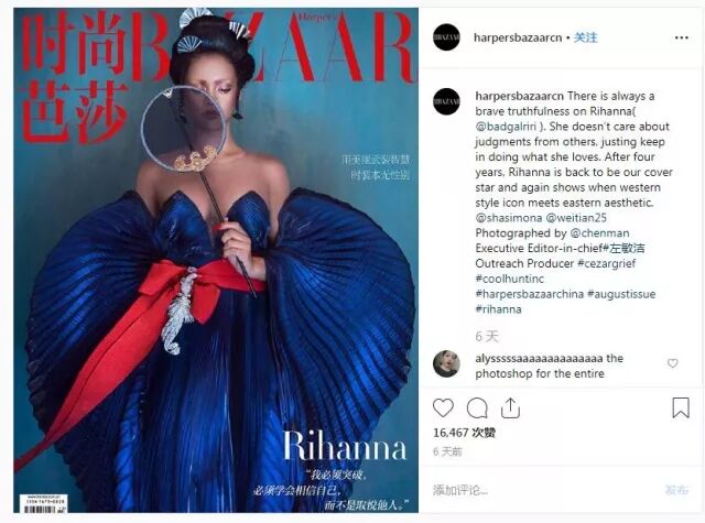 “这不是文化挪用,因为整个《时尚芭莎》中国版的团队都是中国人,也特别在帖子里说明了。是中国人,把蕾哈娜打扮成了这个样子。”