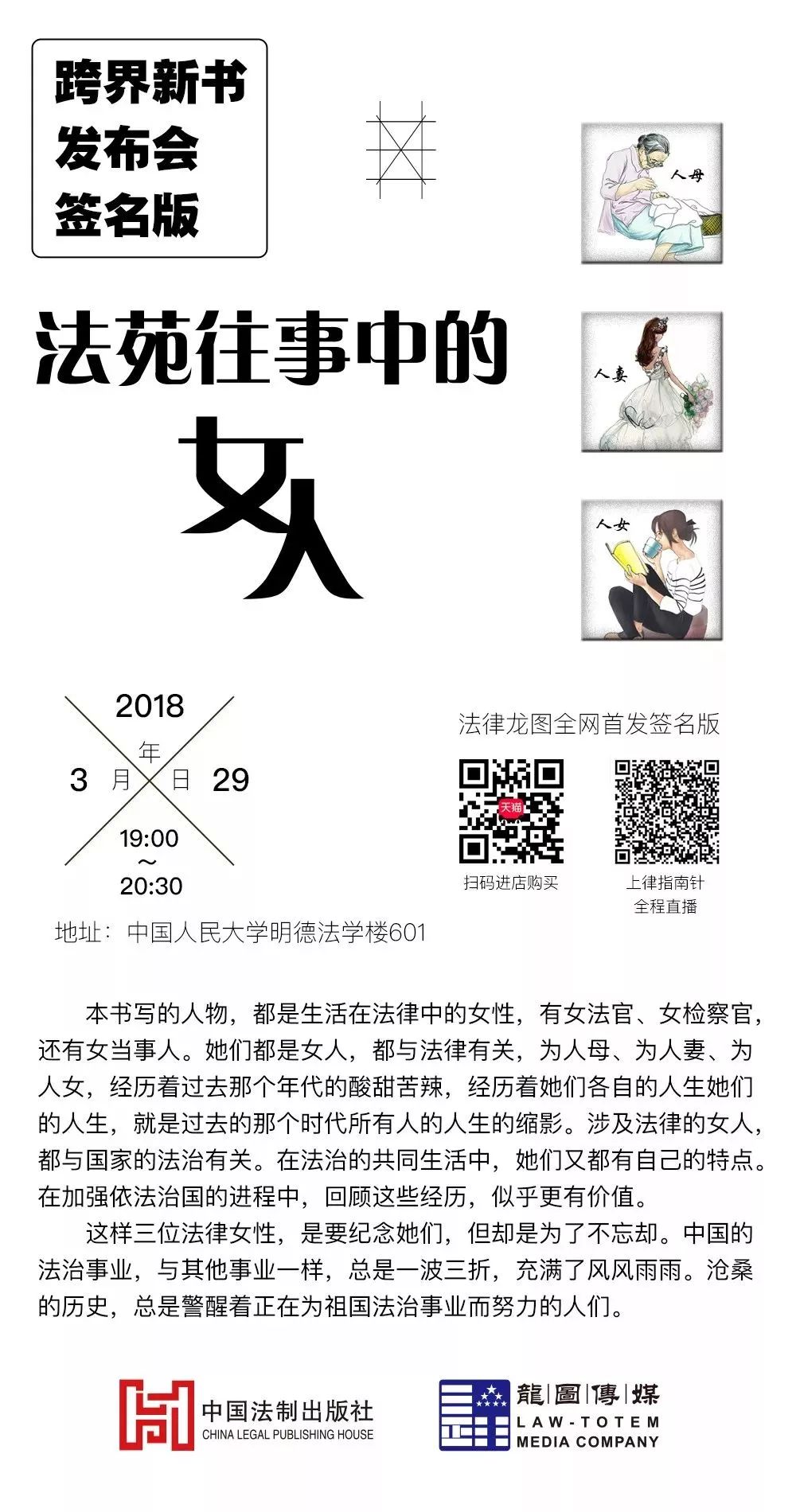 纪念曾经为祖国法治事业而奋斗的人们,包括本书中的女性,并不是为了忘却,而是不忘却。不忘却这些曾经努力过的人,不忘却那个时代的那些难忘的事,更不忘却造就了这样人和事的那些原因。不忘却法治发展的过去,才会有法治发展的现在和未来。不忘却的纪念,恰恰就是要阻却法治发展的过去,不在法治发展的现在和未来重演。为着这样的目的,在我的小说里的人物,都付出了自己的贡献。我们期待后辈比我们做得更好,不愿意我们的经历在后辈的身上重现。