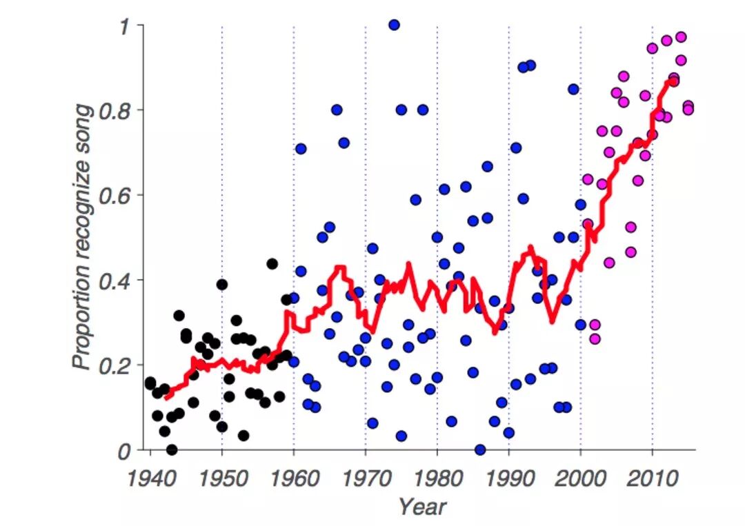 上面这张图的时间轴应该反过来看,随着时间的倒退来看,实验结果主要揭示了美国千禧一代对音乐的集体记忆有三个不同阶段:人们对 2000-2015 年间新歌的遗忘速率最快,而 1960-1990 年间歌曲的记忆最稳定,更早的 20 世纪 40 年代和 50 年代期间也是呈逐年下降趋势。