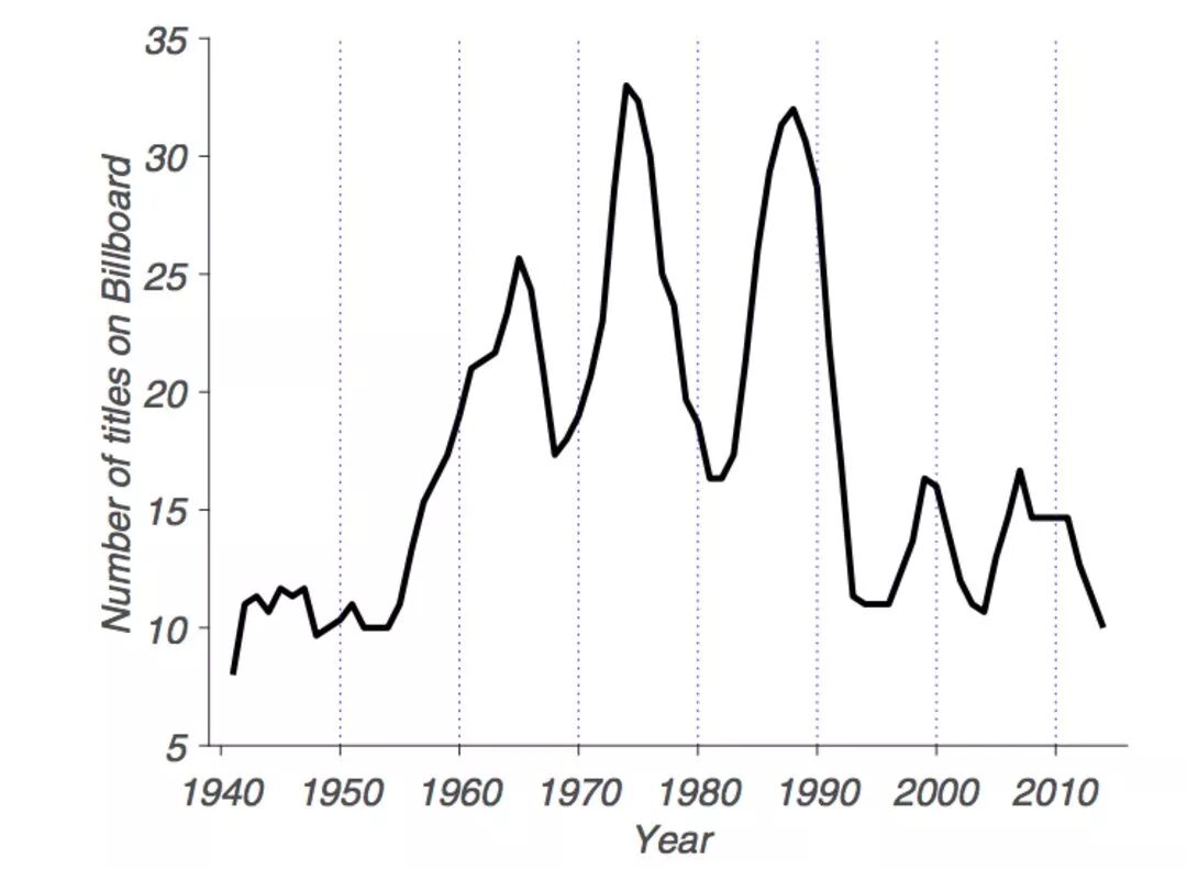 ▲ PLOS ONE:不同时期歌曲在 billboard 排行数量情况