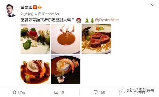 今日,黄宗泽在某社交平台上深夜投毒表示:“圣诞节有谁来陪你吃圣诞大餐?”并且还配上了圣诞节大餐的美食图,看到人直流口水!