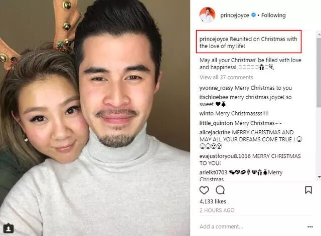 12月25日,郑欣宜更新IG晒出一张与帅气男子的亲密合影,并配文道:“Reunited on Christmas with the love of my life!”中文译后为“在圣诞节与我生命中最爱重逢”。