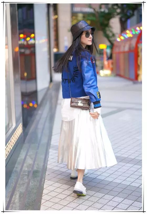 日常风的田海蓉,穿着也是不失时尚。上半身穿着一件蓝色皮夹克,背后还有英文字母印花,尽显街头风。下半身田海蓉选择了一条白色裙子,裙子的长度到小腿处,露出肤如凝脂的脚踝,脚上踩着一双白鞋,真是让人感到活力四射。她戴着一顶黑色的渔夫帽和一个黑色墨镜,给人一种酷酷的感觉。皮衣和白裙本来是不搭的,可是田海蓉却能穿出如此美的效果,真的是不得不让人佩服啊。