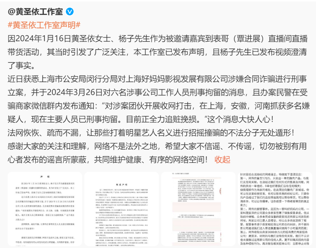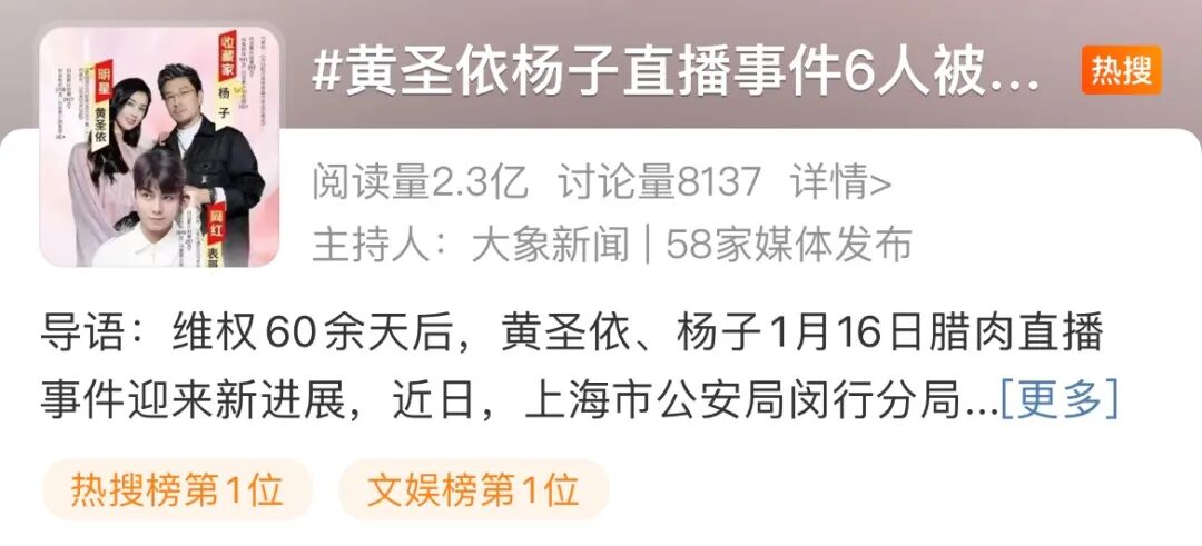 维权60余天后,黄圣依、杨子“1·16腊肉直播事件”终于迎来新进展。王女士在收到上海市公安局闵行分局寄来的立案书后,又等来了好妈妈影视发展有限公司的六名工作人员被刑事拘留的消息。