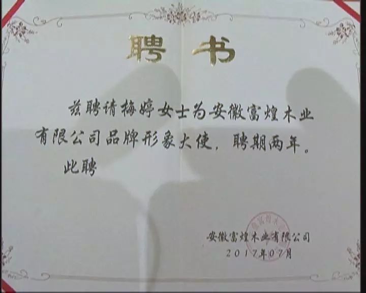 仪式上,安徽富煌木业有限公司负责人与梅婷签约,安徽富煌集团董事长杨俊斌为梅婷颁发形象大使聘书,标志着梅婷正式成为富煌木业形象大使。