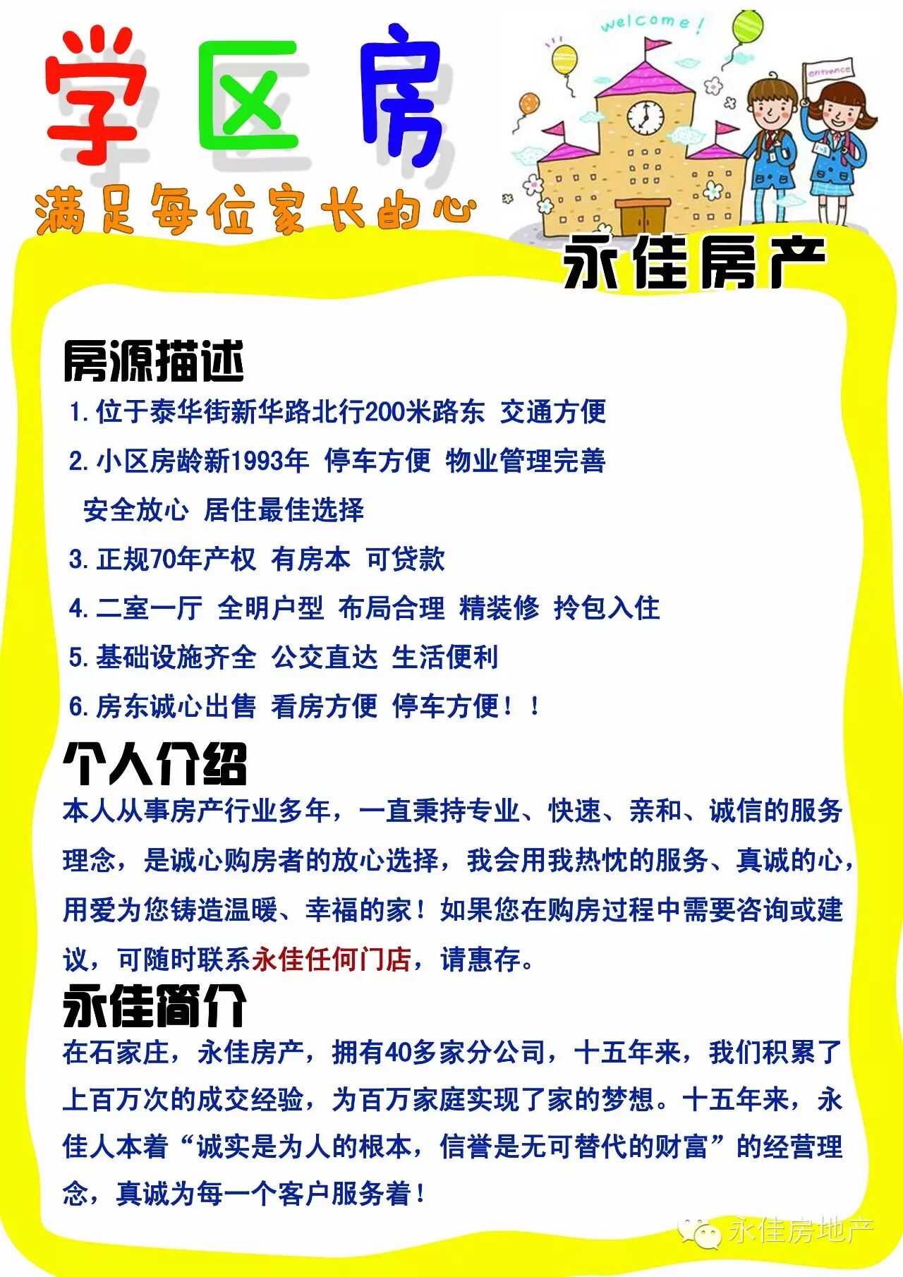功能介绍:欢迎您关注永佳房产,我们本着“满足每颗想家的心”真诚面对每一位客户,如您需要房屋买卖、租赁、代办各类贷款、公积金等。敬请致电0311-87895550!我们会在第一时间为您提供最贴心、最专业、最快捷的服务!