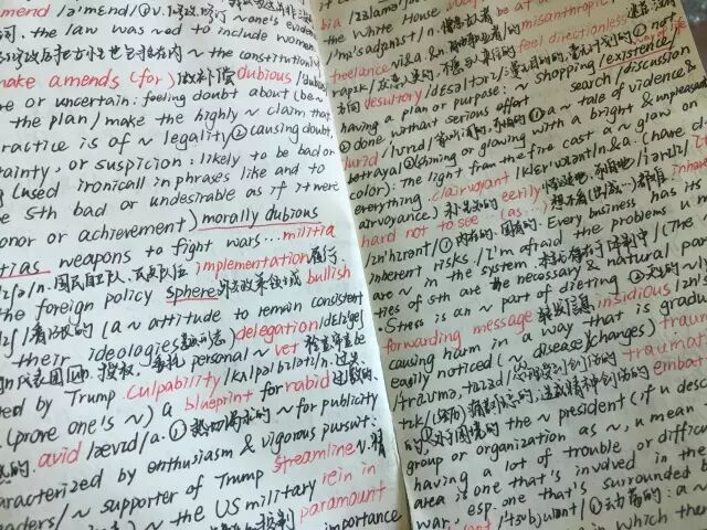 我当时的第一反应就是:这不是高中生的笔记吗?? 我记得我以前高中就喜欢用小本子记英语笔记,走到哪,看到哪。但是我还是没能坚持下来,原因可能是我没Jessie热爱英语吧,要是像Jessie一样坚持下来,我就是全国冠军了。(呵呵哒)