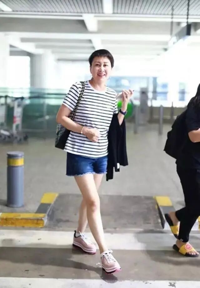 张凯丽的时尚之路从未被年龄禁锢,用休闲风成功get减龄感的她看起来活力感满满。要想整体造型看起来不寡淡,在基础款的白T上加入经典的条纹元素就能轻松加上时尚感。横条纹还是比较容易显胖的,用一件牛仔短裤相搭配,减弱横条纹显胖感的同时还能show出纤直美腿。