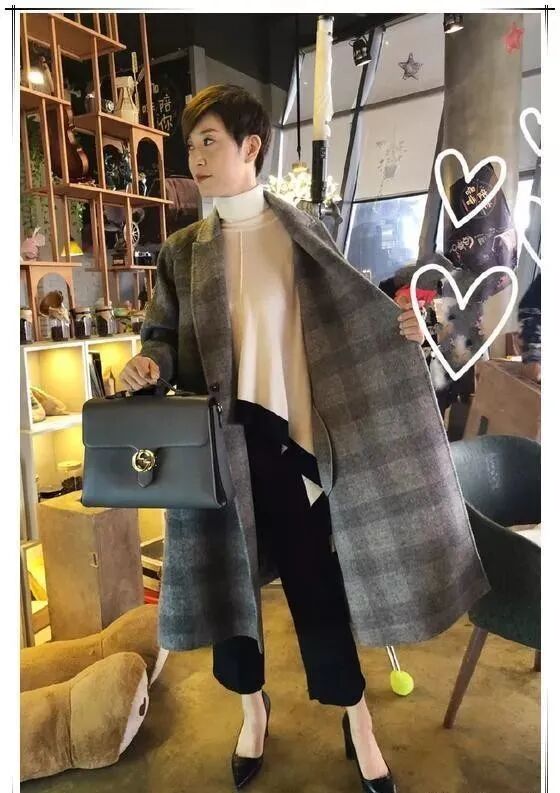 米白色的高领毛衣简约独特,不规则的衣摆更加的大气一些,搭配黑色的九分长裤精干加分,配上黑色的包尖高跟鞋时尚不已,灰色的格子大衣瞬间气场满分。
